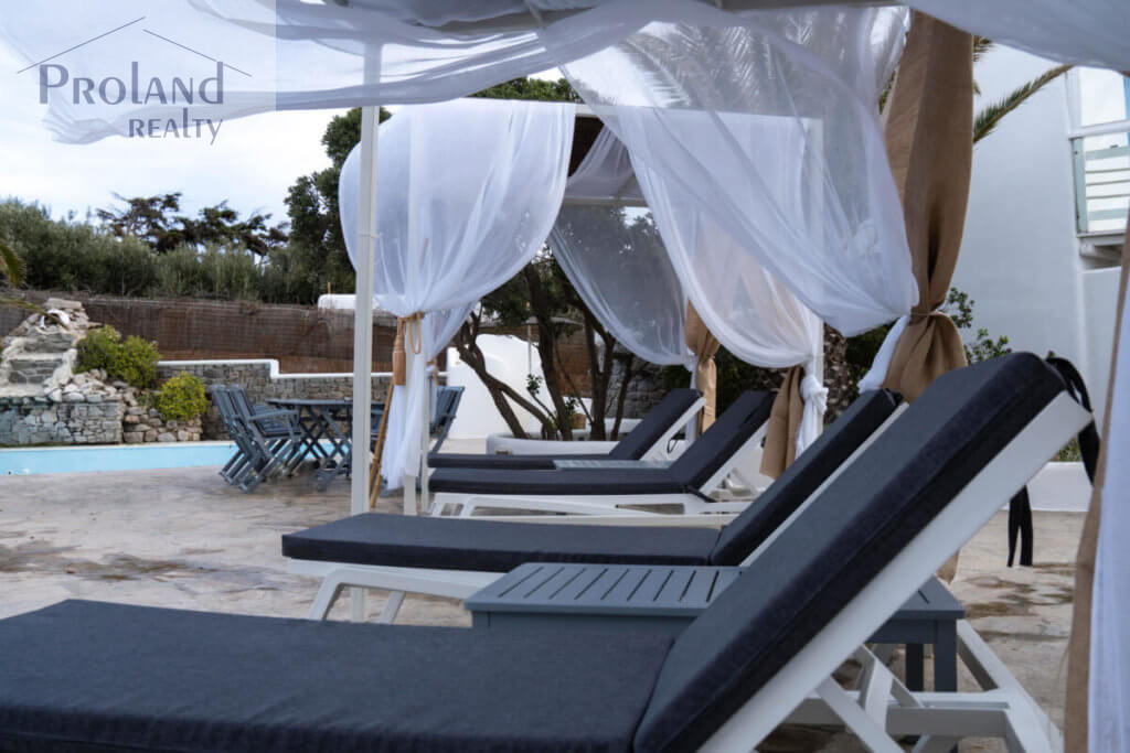 Μύκονος Καλαφάτης, ξενοδοχείο που αποτελείται από 4 βίλες, 7 δωμάτια, συνολικές κλίνες 14, εξοπλισμένα με κουζίνα, κλιματισμός σε όλους τους χώρους, πισίνα, bbq, parking, 400 μέτρα από την παραλία Καλαφάτης.